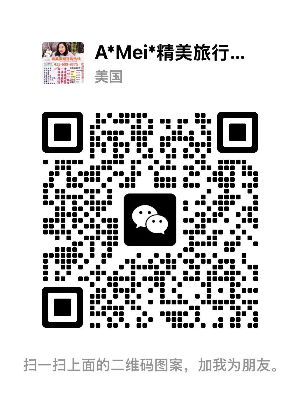Contact Us Emailwonderfulvacationusa@gmail.comTel: +1 415 699 9375WeChat : Scan to connect on WeChat Chat with us on WhatsApp